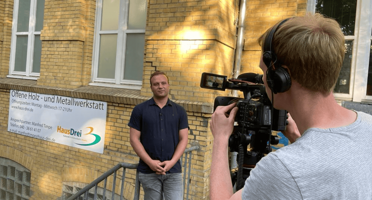 Artin berichtet vor der Kamera über sein Ehrenamt in der Offenen Holz- und Metallwerkstatt im Haus Drei in Altona. Foto: MITmacher