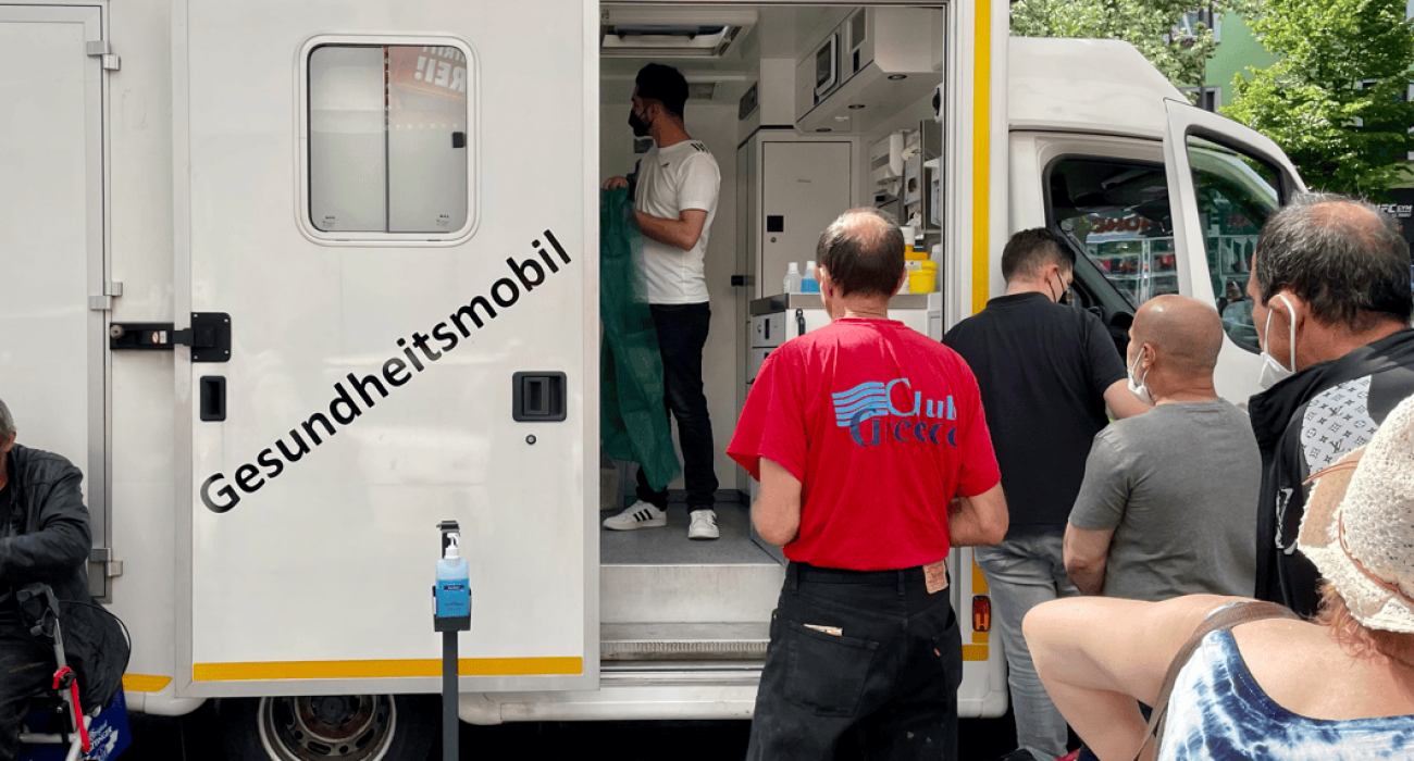 Dort zum Gesundheitsmobil kommen viele Menschen, die eine Verletzung haben, und einen Verband brauchen.