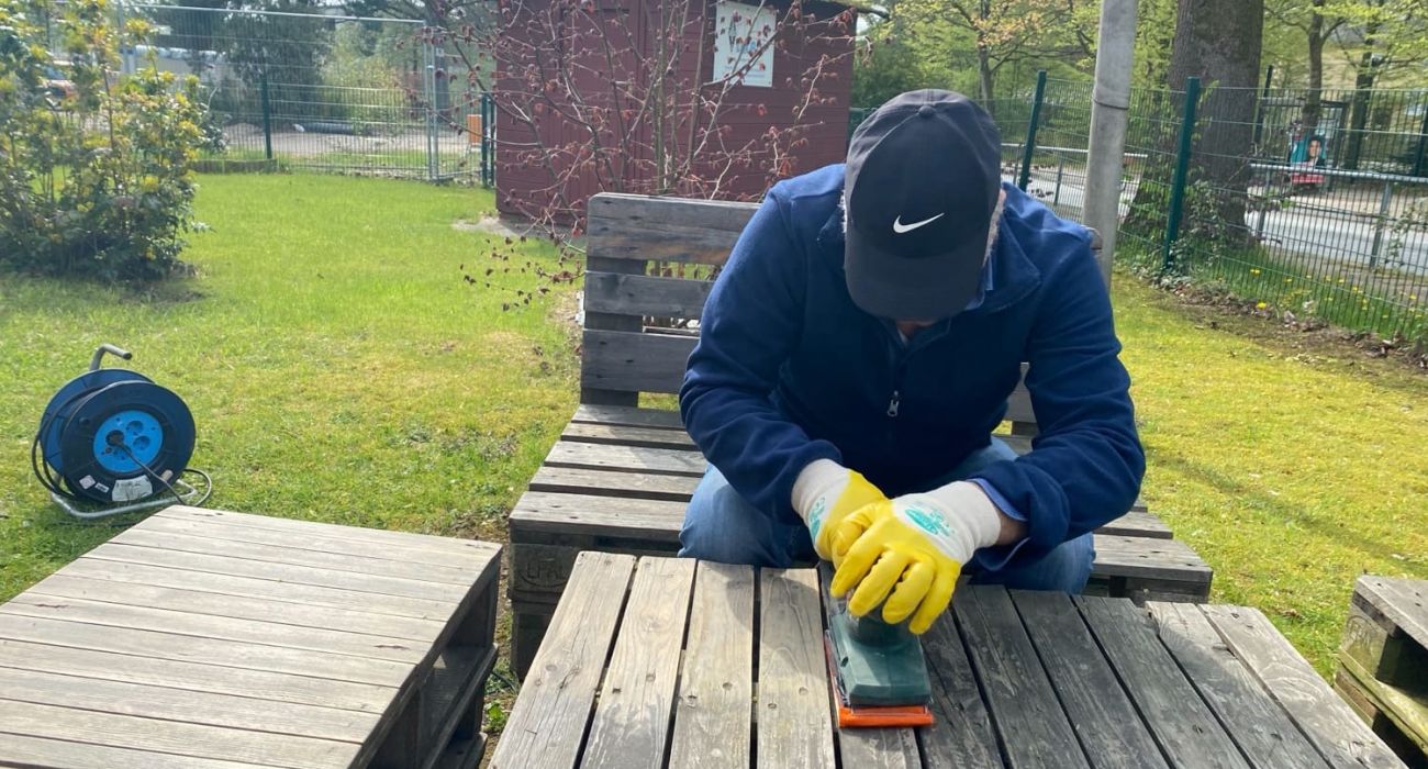 Majid restauriert die Palettenmöbel im Haus Brügge. Foto: Haus Brügge / Sprungbrett Bergedorf e.V.