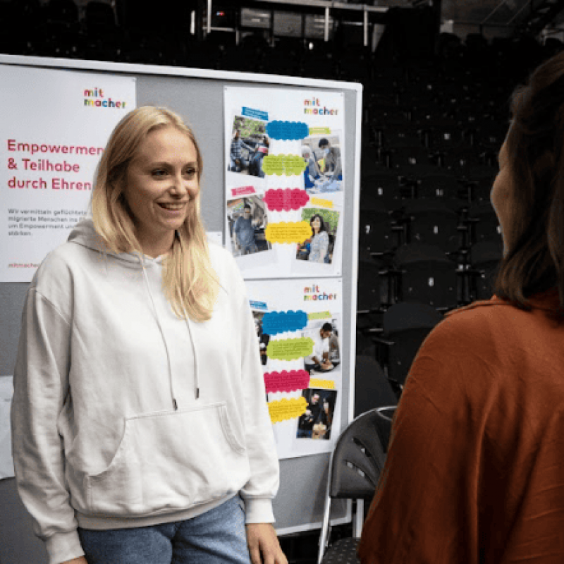 Kira am MITmacher-Stand beim Forum WIR auf Kampnagel im Gespräch mit Ausstellungsbesucher*innen. Foto: Anne de Wolff