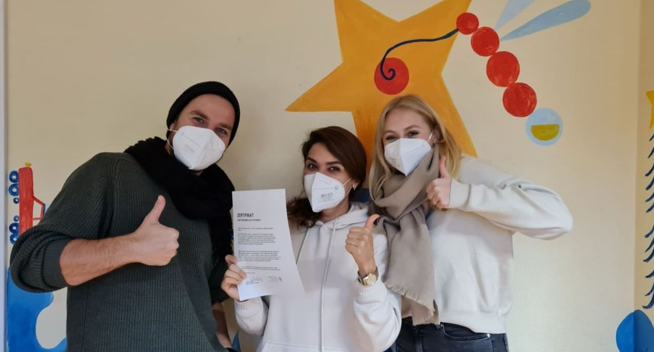 Nayereh mit ihrem Zertifikat nach ihrem Abschlussgespräch mit Jerôme (links) und Kira (rechts). Foto | MITmacher