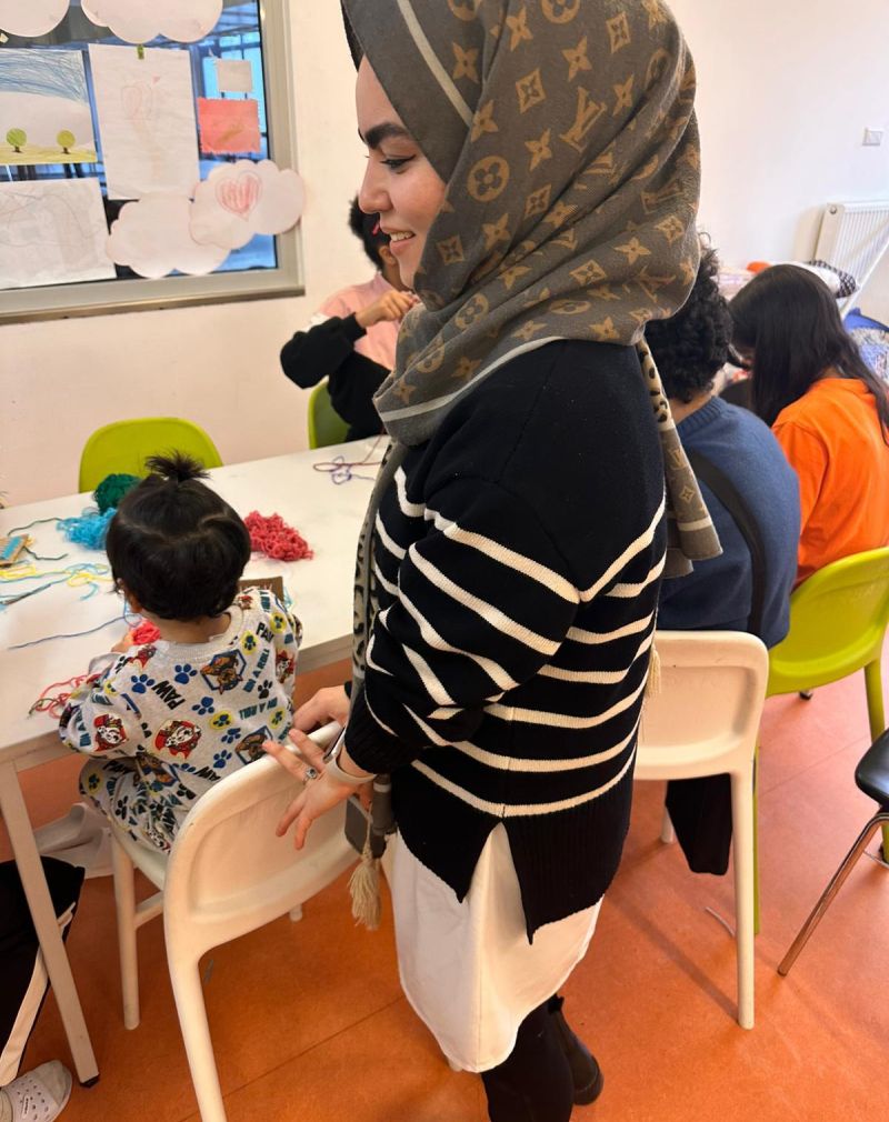 Zinab bei ihrem Einsatz für Kids Welcome HH in der Kinderbetreuung in einer Geflüchtetenunterkunft. Foto: Kids Welcome Hamburg